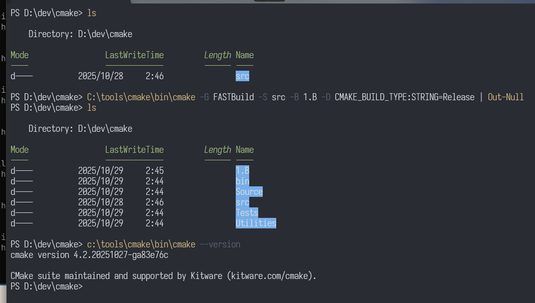 Running CMake with the command cmake -G FASTBuild -S src -G 1.B creates unwanted directories as following